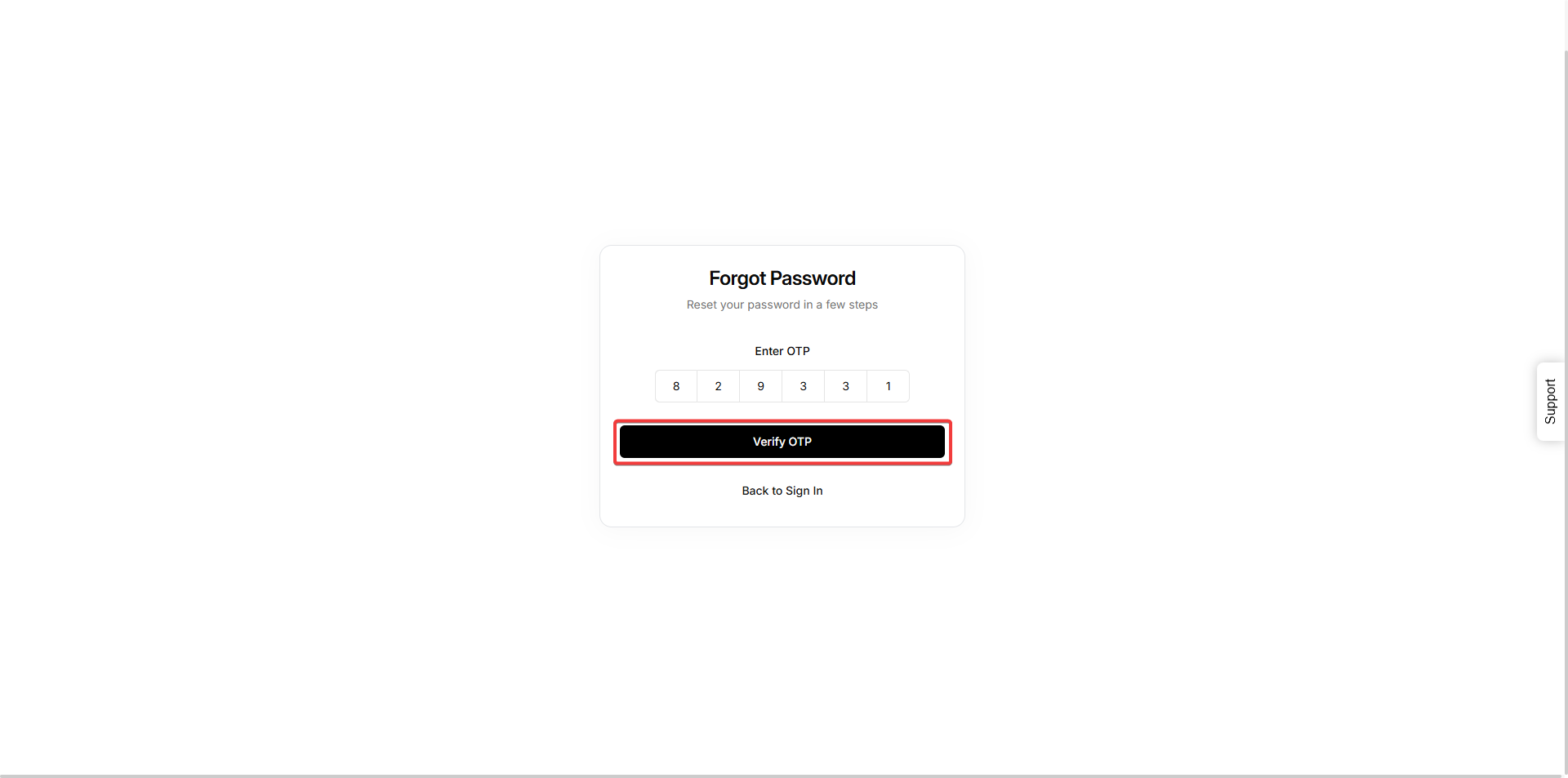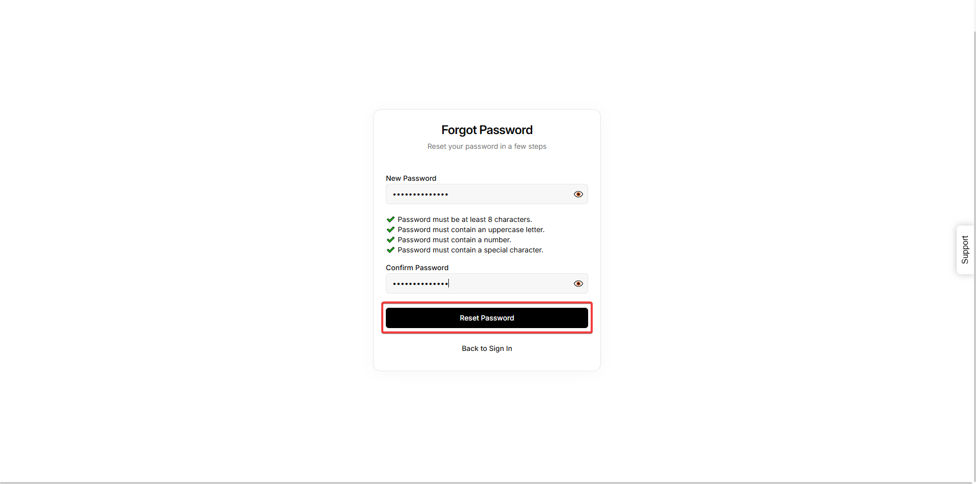 - After verifying, create and confirm your new password. Click Reset Password to save changes.