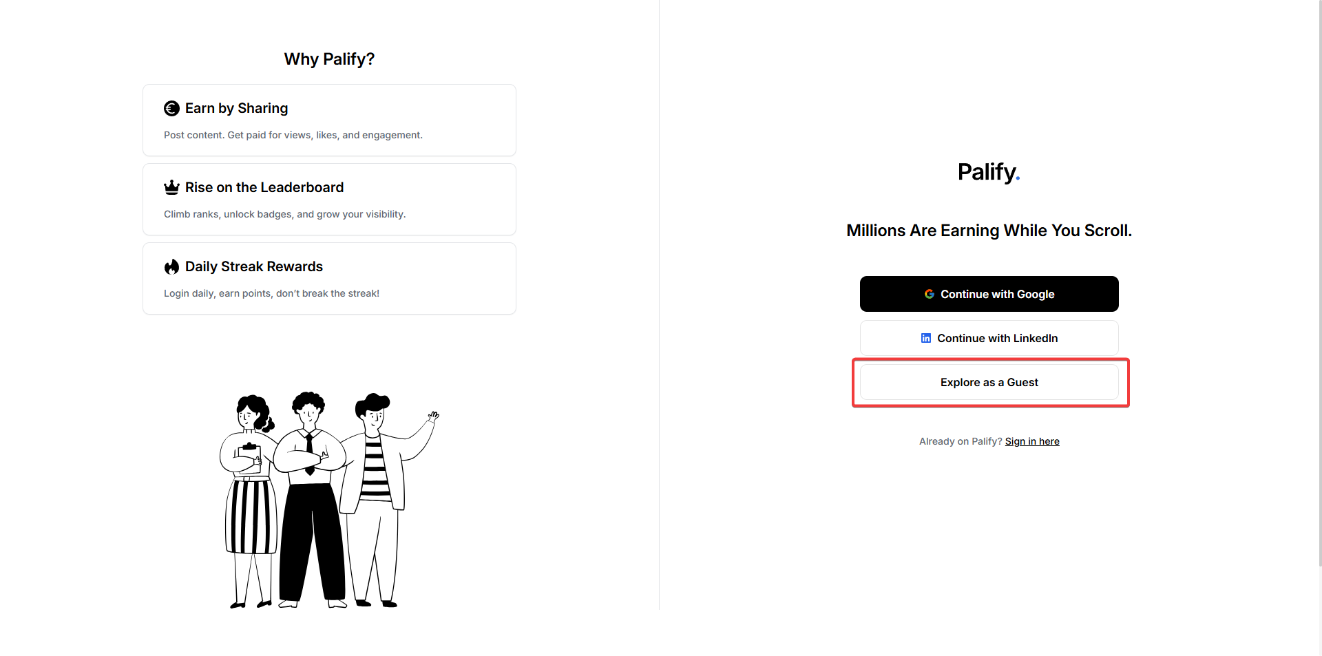 The Sign Up page enables new users to create an account and join the Palify community. It highlights key platform benefits to engage first-time visitors and encourages smooth onboarding.